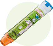 エピペン®は、アナフィラキシーがあらわれたときに使用し、医師の治療を受けるまでの間、症状の進行を一時的に緩和し、ショックを防ぐための補助治療剤(自己投与が可能なアドレナリン製剤)です。
