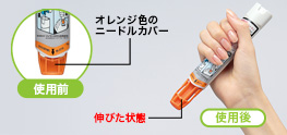 注射後、オレンジ色のニードル(針)カバーが伸びたことを確認します。