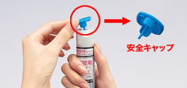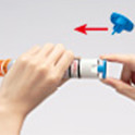 オレンジ色のニードル(針)カバーを下に向けて、エピペン®のまん中を利き手でしっかりと握り、もう片方の手で青色の安全キャップをまっすぐ上に外します。