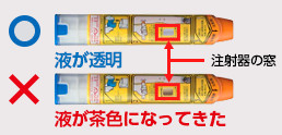注射器の窓から見える薬液が変色していたり、沈殿物が認められたりしないか定期的にご確認いただき、認められた場合は速やかに新しい製品の処方を受けるようお願いします。
