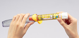 使用済みのエピペン®は、オレンジ色のニードル(針)カバー側から携帯用ケースに戻します。